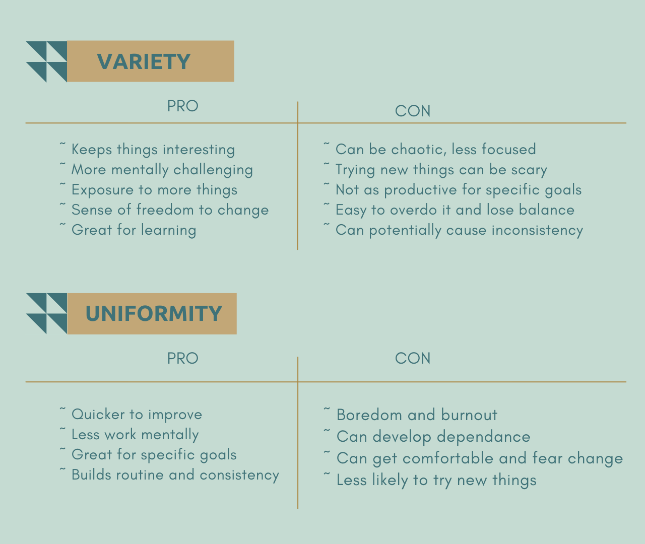 Let's start by talking about the pros and cons of each. Variety and Uniformity both have pros and cons that should be considered.